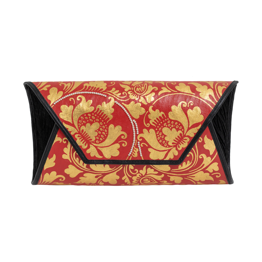 A fashionably oriental summer clutch made from Indonesian Bamboo, hand-woven in wicker style by artisans with traditional skills. The bag is covered in cloth, hand-painted by extremely skilled Balinese artists selectively commissioned by Rolf von Bueren. The clutch has been decorated with tiny Pearls and the internal lining has been covered in silk, brought together in the beautiful shape of an ‘Envelope’.