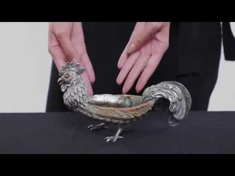 Mexican Abalone shell designed with Sterling Silver into a Rooster, with intricate details of skilled craftsmanship visible on the Silver texture of the Rooster. The bowls are iridescent, showing luminous colors that seem to change when seen from different angles and being organically formed, each has its own unique patterns. They are light in weight, durable and finely finished.