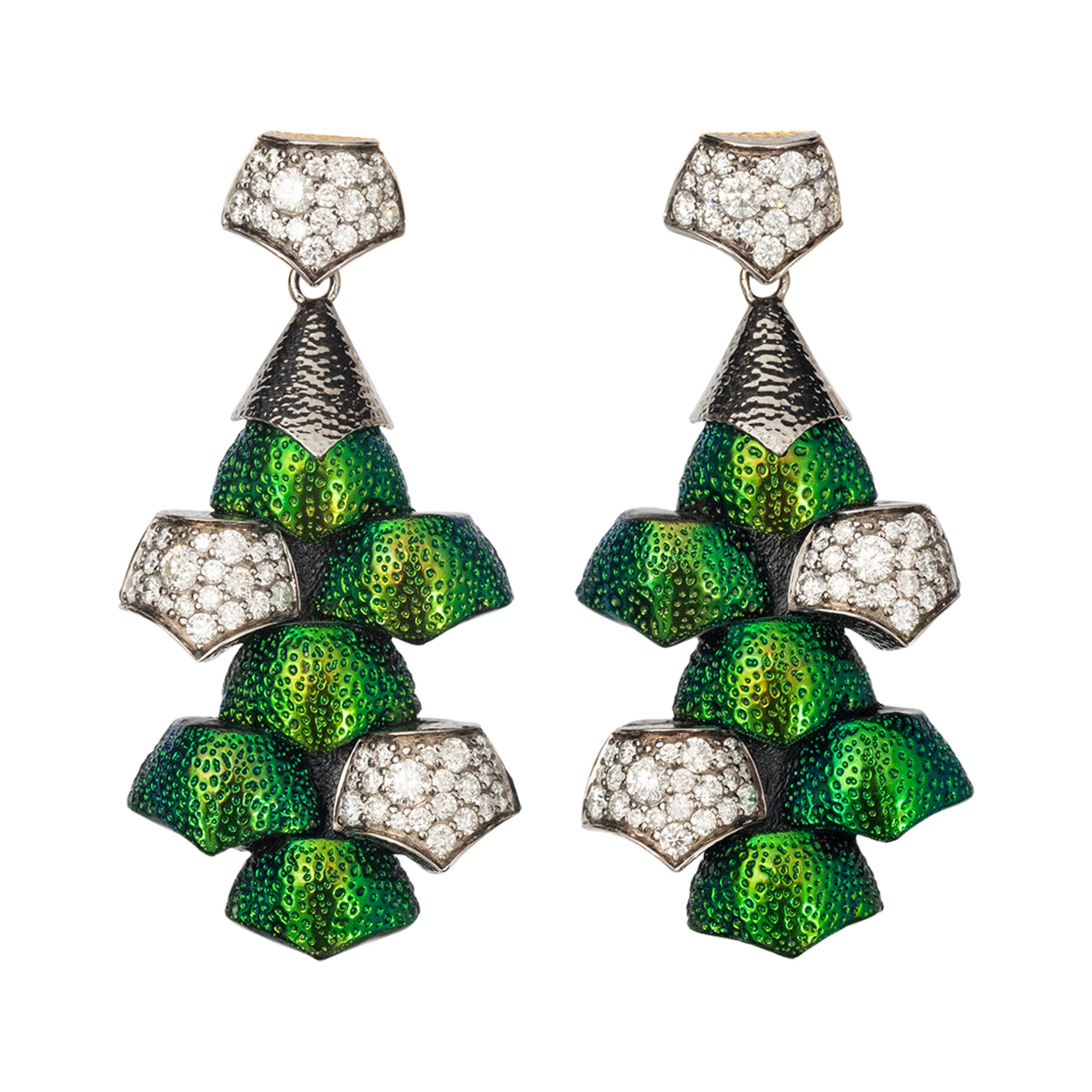 A pair of Scarab Chandelier earrings, embellished with iced diamonds set in Black Rhodium plated Sterling Silver and 18K Gold. Gorgeously dropping from the ears as Chandeliers, a design like this can be worn for casual day based gatherings where the light of the day brings out the life of these designs in its iridescence shades. It transforms into a sophisticated cocktail Earrings with the lights sparkling the striking Diamonds amongst the Scarab Wings.