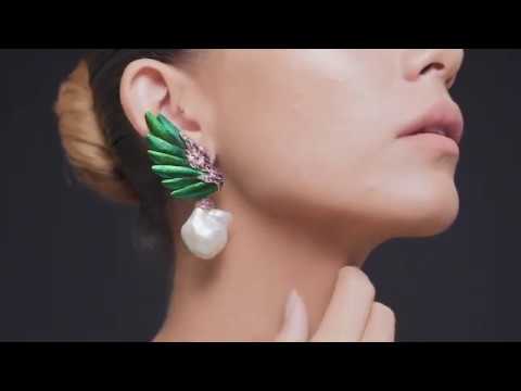 A pair of Scarab Earrings in a ""Angel Wing"" design, embellished with white rose-cut Diamonds and Pink Tourmalines. A beautiful free-form Pearl drop completes the design. The earrings can be worn for sophisticated evenings where a dash of light brings out the iridescence of the Scarab wings as well as lights up the striking colours of the precious stones.