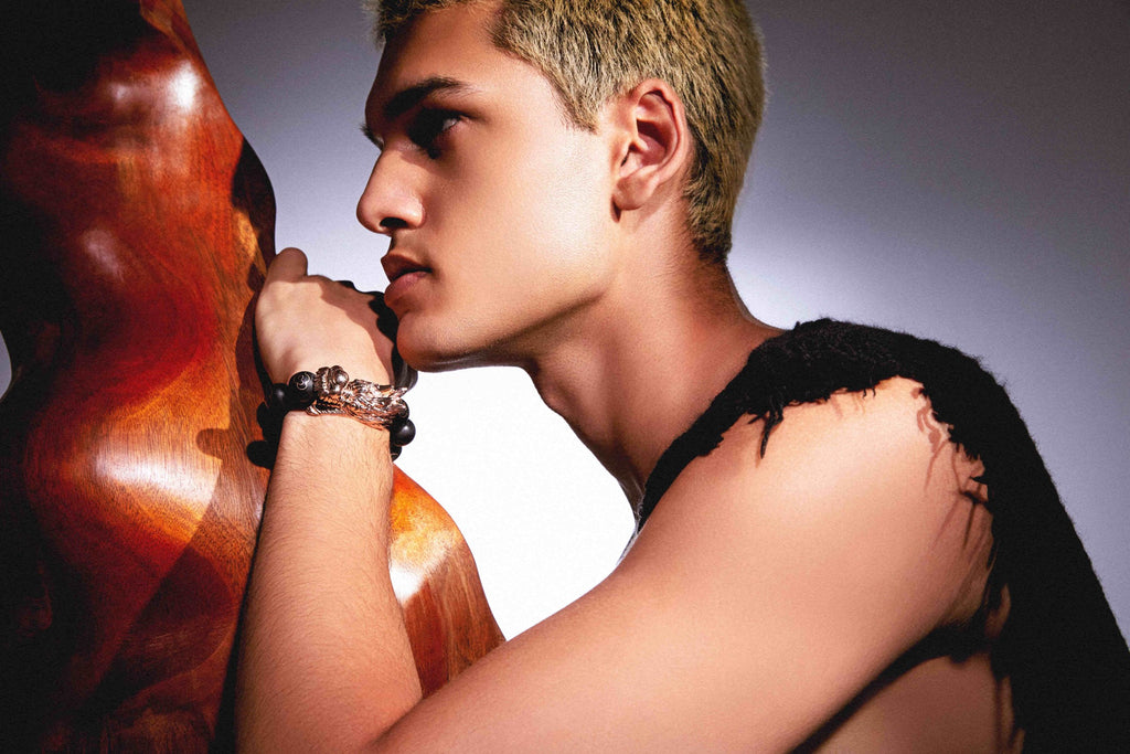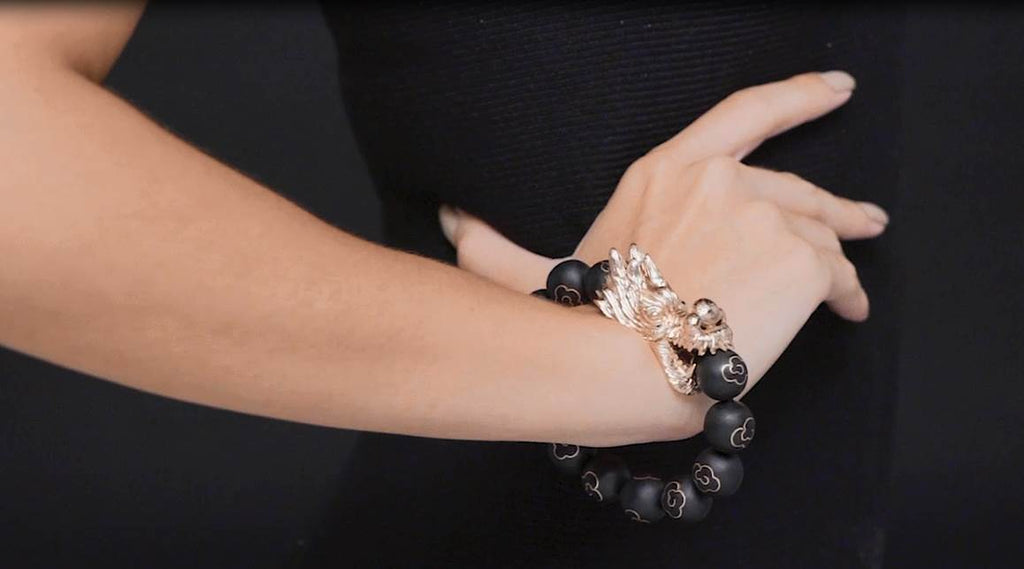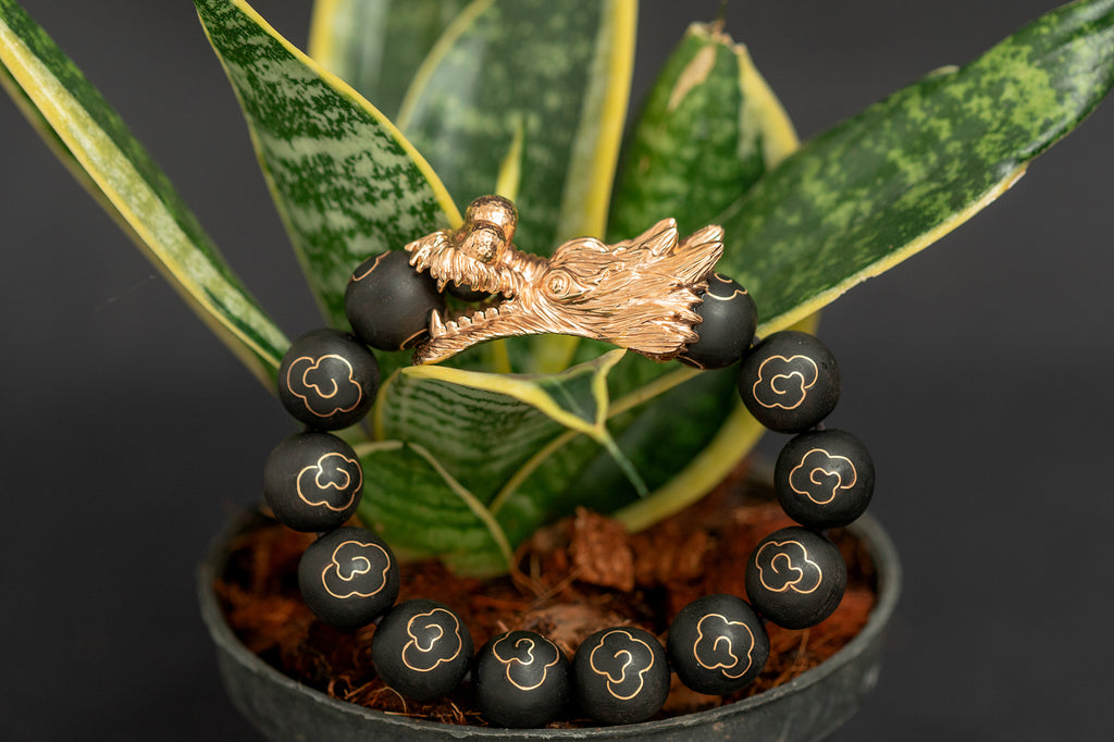| Dragon Bracelet, crafted with Gold inlaid Ebony beads in a spiritual cloud design, with the Dragons head designed in 9K Gold Plated Sterling Silver. As a totem, Dragons traditionally symbolize potent and auspicious powers, particularly control over water, rainfall, typhoons, and floods. The dragon is also a symbol of power, strength, and good luck for people who are worthy of it in East Asian culture. The Dragon is also the fifth of the 12 Chinese zodiac animals. The Year of the Dragon is associated with the Earthly Branch symbol 辰, pronounced chen. According to Chinese zodiac compatibility, people born in the Year of the Dragon could get along well with Rooster, Rat, and Monkey. It took approximately 10-12 weeks labors to create this piece. Size: 6.5" Weight: 62.13 gms. |