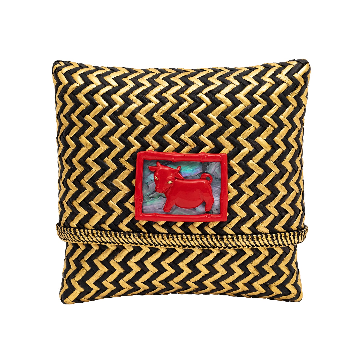 An elegant clutch made from Indonesian sun-dried Rattan, hand-woven by artisans with traditional and oriental skills. The natural hues of the Rattan bag have been painted in alternating patterns of Black and Gold painted and has been lined inside with Silk. The centerpiece of the bag has a strikingly beautiful Abalone Shell Centerpiece and Fiberglass with Red Lacquer decorated with Diamond.