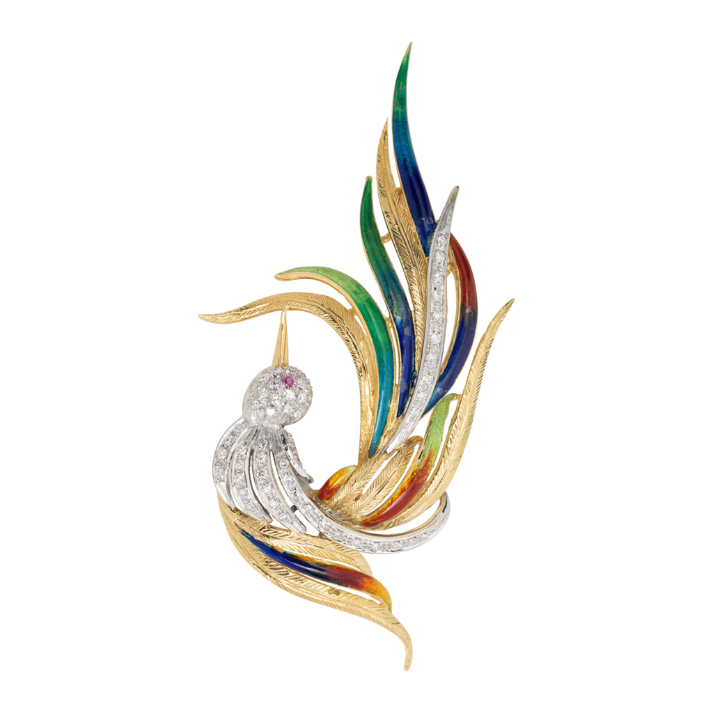 18K yellow and white gold bird brooch set with Diamonds, Ruby and finished with multicolored enamel work